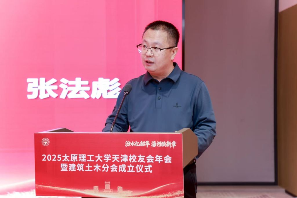 随后,2025 年太原理工大学天津校友会年会暨建筑土木分会成立仪式正式拉开帷幕。签到环节后,活动在庄严的太原理工大学校歌声中开启。张法彪会长在致辞中回顾了天津校友会成立以来的发展历程,介绍了科技部、组织部等职能部门的建设成效,并明确 2026 年三大发展方向:强化科技赋能,促进校友企业资源共享与产业融合;丰富文体活动,增进校友情感联结与人才遴选;优化组织架构,扩大校友会影响力,全力办好成立五周年庆典与承办太原理工大学校友工作会议两大重点任务。