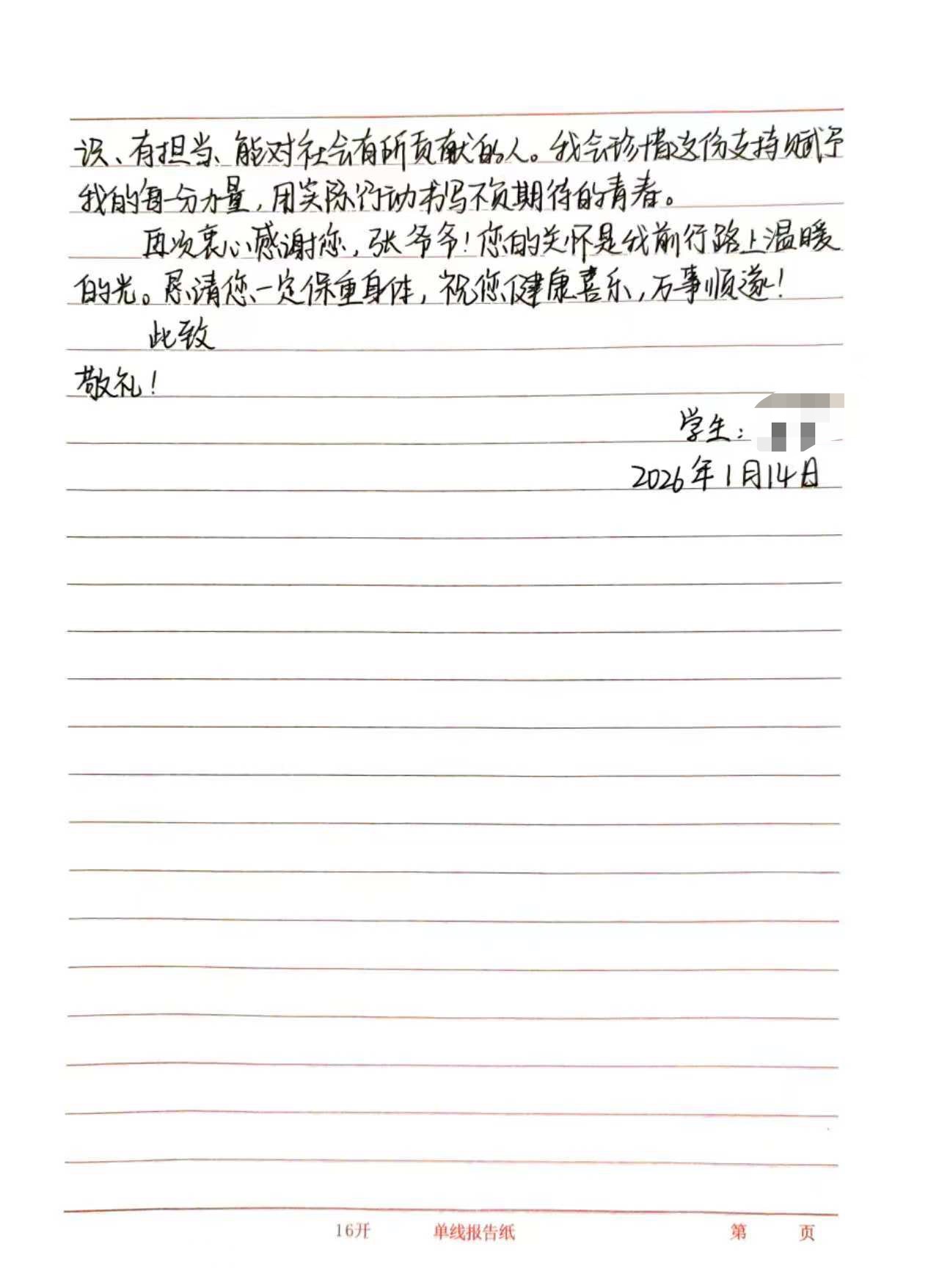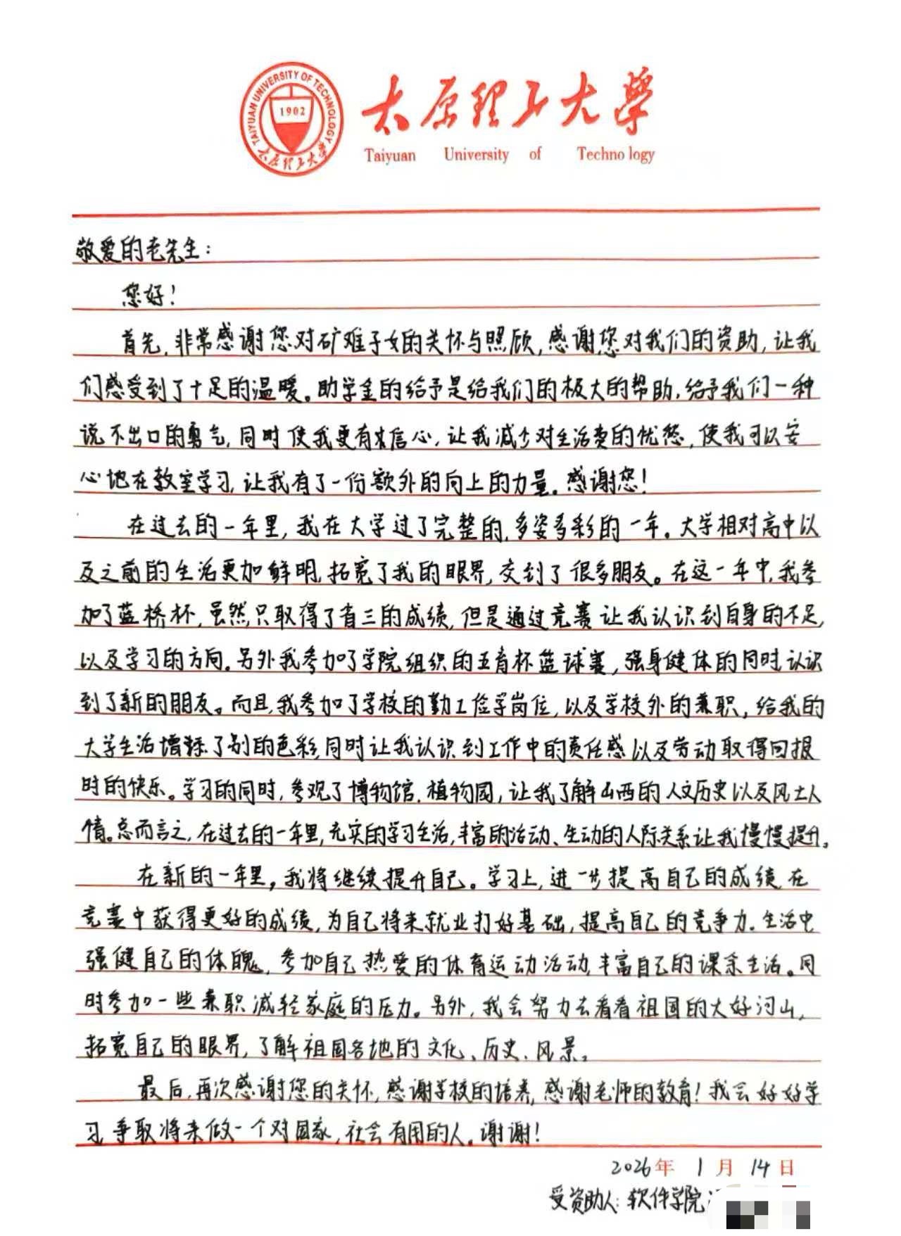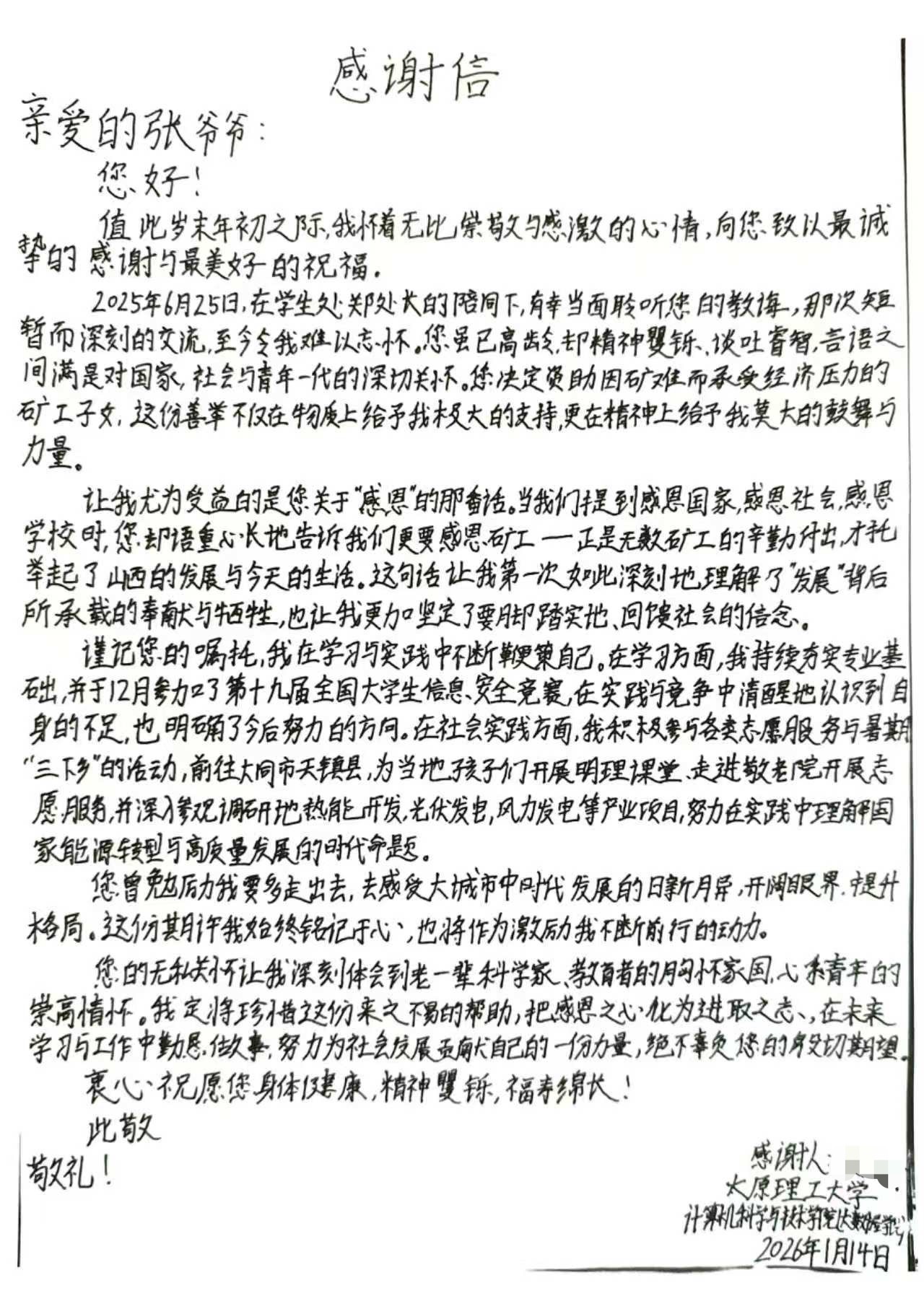 随行工作人员还带去了受助矿工子女的亲笔感谢信。信中,同学们真挚讲述了张老的资助如何让他们减轻生活压力、坚定求学信心,并分享了在学业与实践中的成长收获。他们在信中写道:“ 您的叮嘱我们铭记于心,未来我们定会将这份温暖传递下去,努力成为对国家、对社会有用的人。”