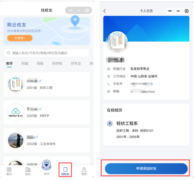 ·可查找校友、老师,在线互换名片,再续同窗与师生情谊。