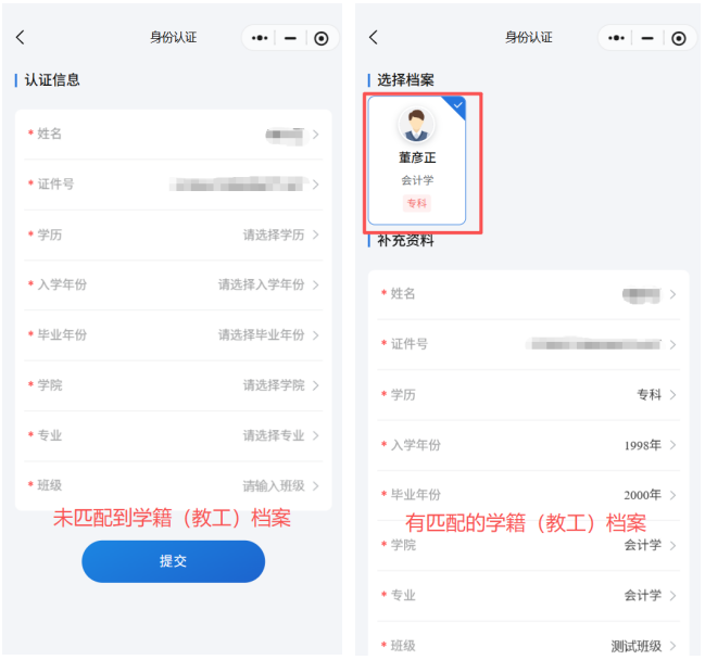 选择相应认证通道后,系统会根据身份证号自动匹配学籍(教工)档案,有匹配的学籍档案时,上方选择档案,下方展示档案信息;