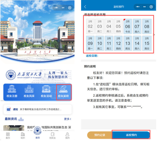 · 可线上预约返校,便捷回归母校,重温校园时光。