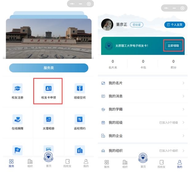 在小程序服务页面点击“校友卡申领”,或我的页面点击“立即领取”,即可领取电子校友卡。
