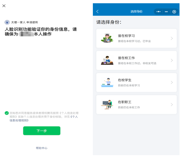 人脸识别成功后,选择个人身份“曾在校学习”、“曾在校工作”、“在校学生”、“在职职工”。
