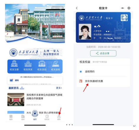 2、按照校友注册引导,登陆成功后即可点击右下角"我的",然后点击“京东快递8折优惠”。
